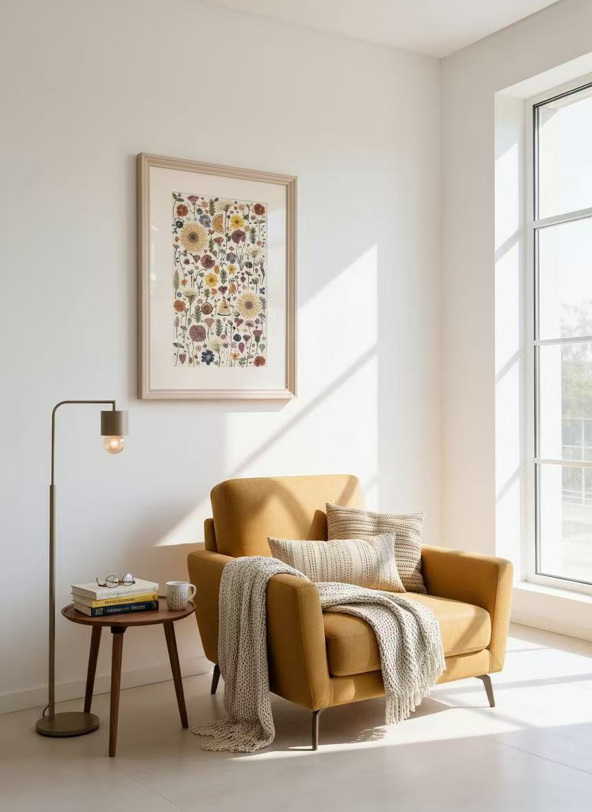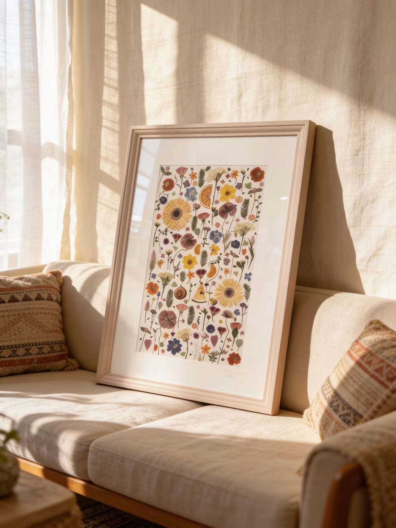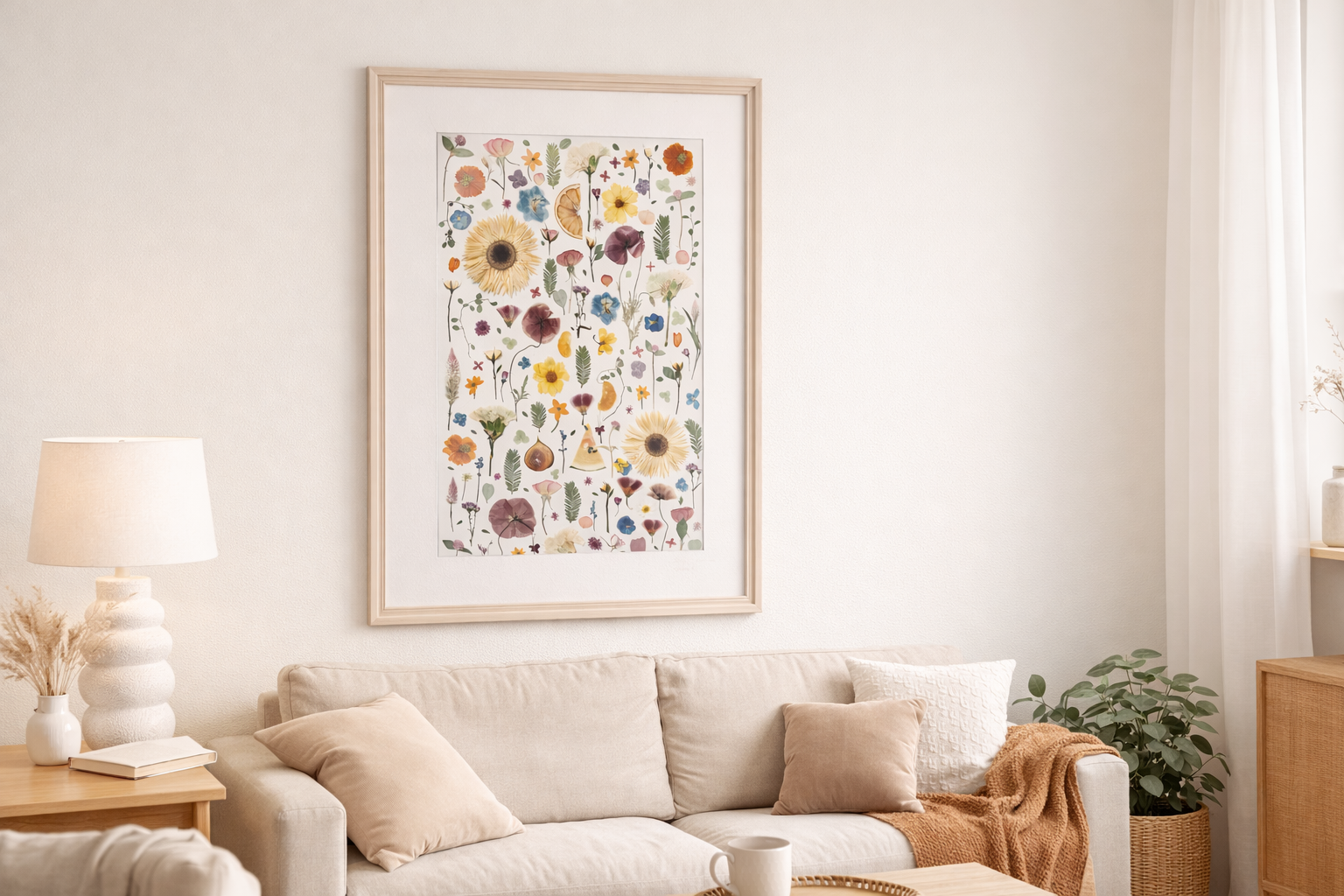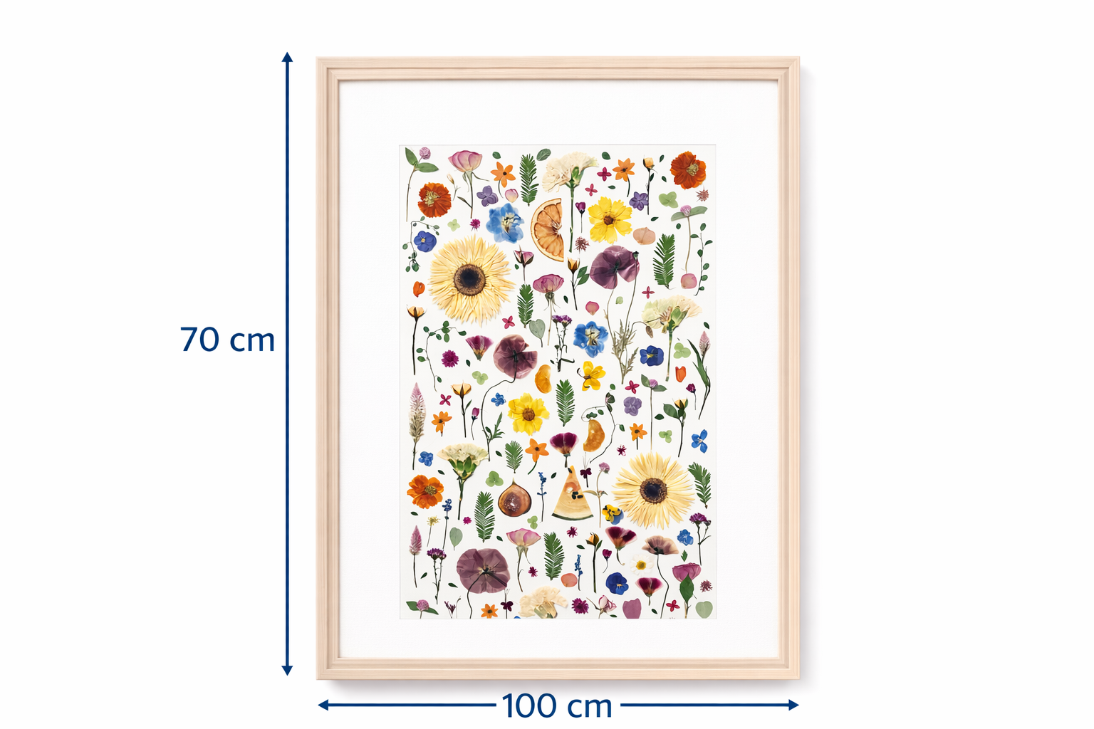 This piece captures the fresh beauty of pressed flowers, arranged with care to brighten any room. The vivid colors and clean design bring a touch of nature’s charm into your space, perfect for adding a splash of life to your home or office.